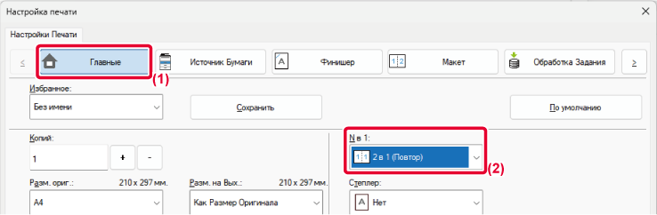 в лоток 1 обычной бумаге и загруженной в лоток 2 цветной бумаге,