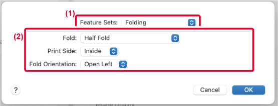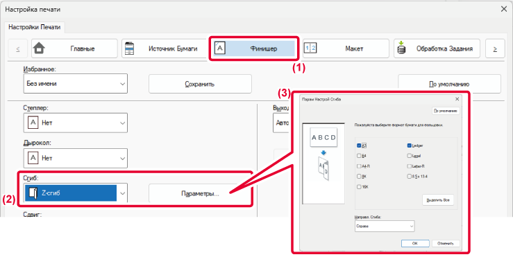 Несколько листов одновременно сгибаются по центру. Если установлен финишер-брошюро вщик (большой накопитель), можно выбрать один или несколько листов. |
