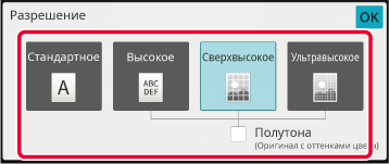 Выберите это значение, если оригинал представляет собой фотографию или в нем имеются переходы цвета (например, цветной оригинал). Это значение обеспечит получение более четкого изображения, чем при использовании только значения [Высокое], [Сверхвысокое] или [Ультравысокое]. Полутон нельзя выбрать, если задан параметр [Стандартное]. |