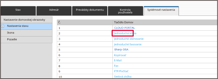 V prípade predvoleného výrobného nastavenia musíte po zadaní IP adresy zadať svoje používateľské heslo.Na webovej stránke kliknite na kartu [Nastavenia systému]→ [Nastavenie domovskej obrazovky] → [Poloha tlačidla Domov].