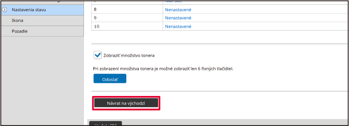 Pri niektorých nastaveniach budete musieť po kliknutí na položku [Nastavenie domovskej obrazovky] zadať svoje používateľské heslo. Ak ste nevykonali overenie používateľa, musíte zadať heslo administrátora.Kliknite na ponuku [Nastavenia stavu] a potom na tlačidlo [Návrat na predv. možnosti].