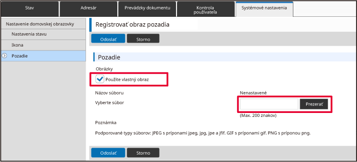 Kliknite na tlačidlo [Prezerať] a vyberte obrázok, ktorý sa má odoslať.Po dokončení nastavení kliknite na tlačidlo [Odoslať].