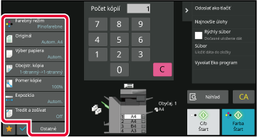 FAREBNÉ REŽIMY KOPÍROVANIAVÝBER ORIENTÁCIE A VEĽKOSTI ORIGINÁLUVÝBER ZÁSOBNÍKA PAPIERA NA KOPÍROVANIEAUTOMATICKÉ 2-STRANNÉ KOPÍROVANIESAMOSTATNÉ ZVÄČŠENIE/ZMENŠENIE DĹŽKY A ŠÍRKYAUTOMATICKÉ NASTAVENIE EXPOZÍCIE A TYPU ORIGINÁLUVÝSTUP