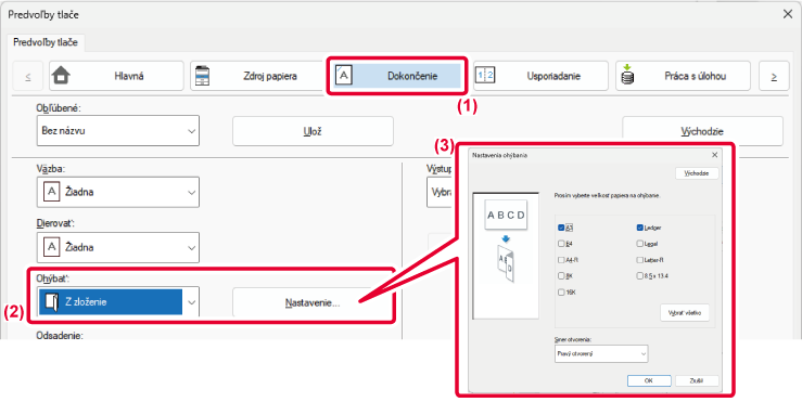 Viacnásobné hárky sú spoločne prehnuté v strede. Keď je nainštalovaná dokončovacia jednotka sedlovej väzby (veľký zásobník), je možné vybrať jeden alebo Vonku - viacero hárkov. |