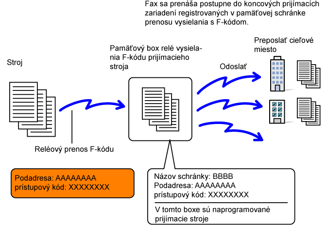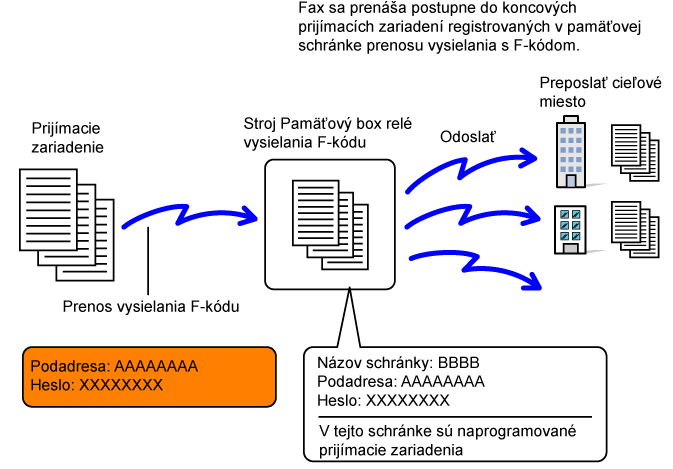 prenos vysielania pomocou F-kódu, fax sa prijme a uloží do pamäťovej schránky