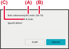 Zobrazené číslo predstavuje počet naskenovaných hárkov originálu – nie počet naskenovaných strán originálu. Keď napríklad vykonávate obojstranné kopírovanie pomocou jedného originálu, zobrazí sa číslo "1", čo znamená, že sa naskenoval jeden originál (nezobrazí sa číslo "2" ako označenie skenovania prednej a zadnej strany hárka).Klepnutím na tlačidlo [Odoslať] spustíte prenos.