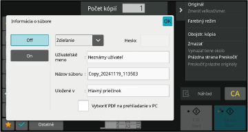 Keď sa spustí táto funkcia, obrazové údaje originálu sa uložia do priečinka Rýchly súbor.Po dotknutí sa tlačidla [Súbor] funkcie
