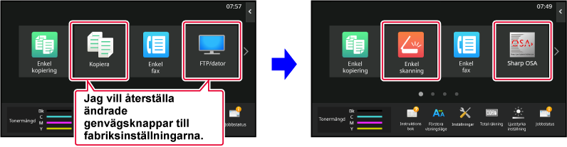 Inställningarna lagras i maskinen och aktiveras.Du kan lägga till snabbknappar på startskärmen