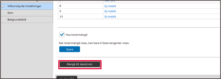 För en del inställningar måste du ange ditt användarlösenord när du har klickat på [Hemskärms- inställning]. Om du inte använt användarautentisering måste du ange administratörslösenordet.Klicka på [Villkorsstyrda Inställningar] och [Återgå till grundinställning].
