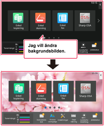 Skärmen ändras till inställningsskärmen.Tryck på [System- inställningar] → [Hemskärms- inställning] → [Bakgrundsbild] och därefter på knappen [Ändra].