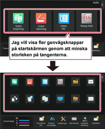 Inställningarna lagras i maskinen och aktiveras.Det finns flera förinställda startskärmslayouter