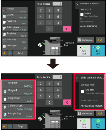 Inställningarna lagras i maskinen och aktiveras.Du kan ändra genomskinligheten på snabbknapparna.