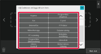 För en del inställningar måste du ange ditt användarlösenord när du har klickat på [Hemskärms- inställning]. Om du inte använt användarautentisering måste du ange administratörslösenordet.Välj den funktion som du vill lägga till.