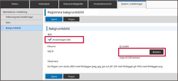 Skärmen ”Registrera bakgrundsbild” visas.Ställ in kryssrutan [Använd egen bild] på