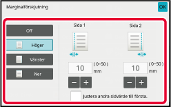 Tryck på det numeriska visningsfältet för marginalförskjutningsområdet på fram- eller baksidan och specificera området med sifferknapparna.Tryck på någon av knapparna [Färg Start] eller [SV/V Start] för att börja kopiera.