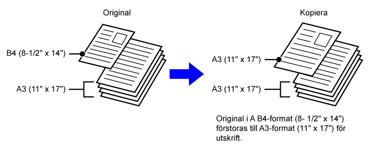 Använd den här inställningen för original som har 2 olika format och sidor med olika längder. Den här inställningen kan endast användas med följande kombinationer av format: • A3 och B4 • A3 och B5 • B4 och A5 • A4 och B5 • B4 och A4R • B4 och A5 • B5 och A4R • B5 och A5 • 11"x17" och 8-1/2"x14" • 11"x17" och 8-1/2"x13" • 11"x17" och 5-1/2"x8-1/2"