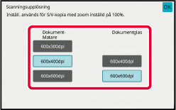 Upplösningen kan ställas in på både dokumentmataren och dokumentglaset. Tryck på [OK] och [Föregående] efter varandra när du är klar med inställningarna.Lägg i originalet.