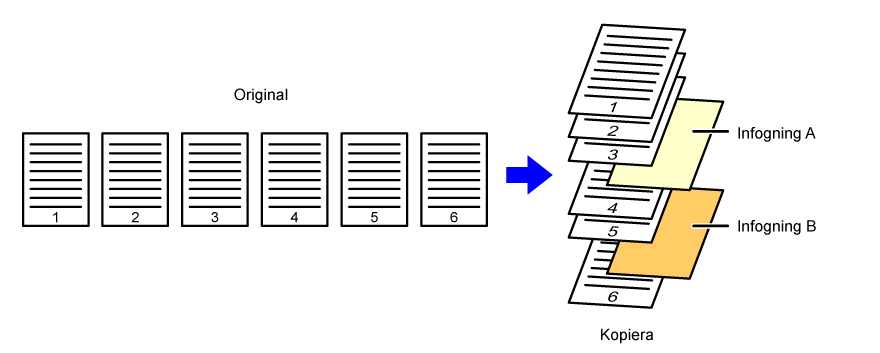 ![]() Infogar en framsida före kopiorna och gör en dubbelsidig kopia av den femte och sjätte originalsidan som baksida. |
