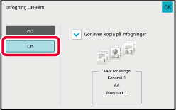 Placera originalet i dokumentinmatningsfacket i den automatiska dokumentmataren eller på dokumentglaset.Tryck på knappen [Övrigt] och därefter på [Infogning OH-Film].