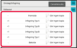 Tryck på knappen [OK] för att avsluta jobbet efter att ha kontrollerat sidlayouten.Ändra inställningar för omslag eller infogningsark.