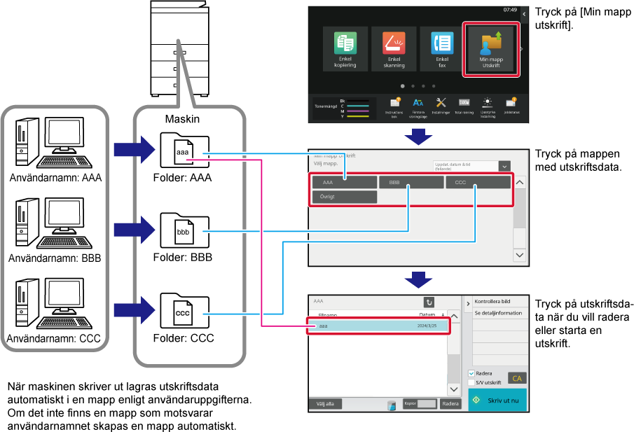 Användare kan skriva ut utskriftsdata från sina mappar på