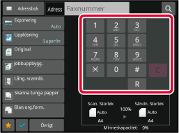Placera originalet i dokumentinmatningsfacket i den automatiska dokumentmataren eller på dokumentglaset.Ange destinationens faxnummer.