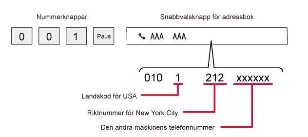 och landskoden (t.ex. "81" för Japan) för att lägga in en paus och
