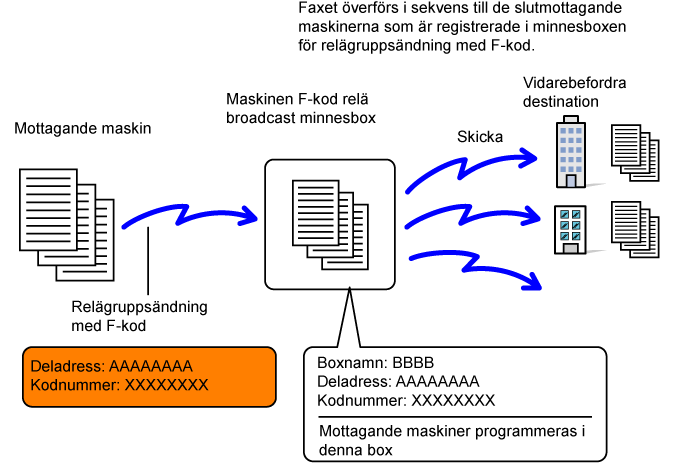 med F-kod tas faxet emot av och lagras i minnesboxen för relägruppsändning