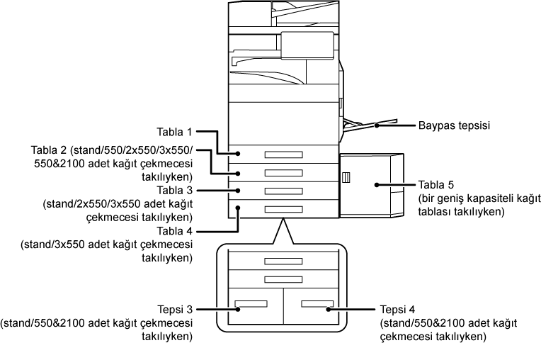 *1 Bir stand/550 sayfa kağıt çekmecesi/stand/2x550 sayfa kağıt çekmecesi/stand/3x550 sayfa kağıt çekmecesi/stand/550&2100 sayfa kağıt çekmecesi takılı olduğu zaman.