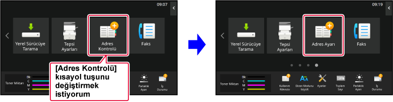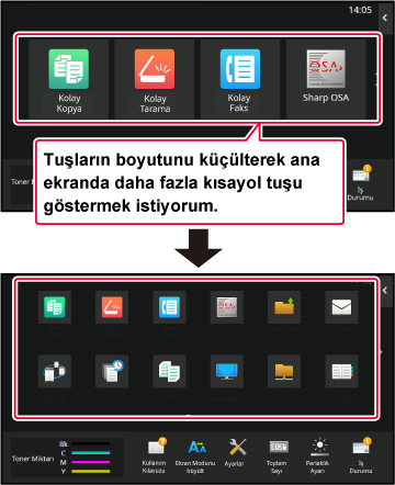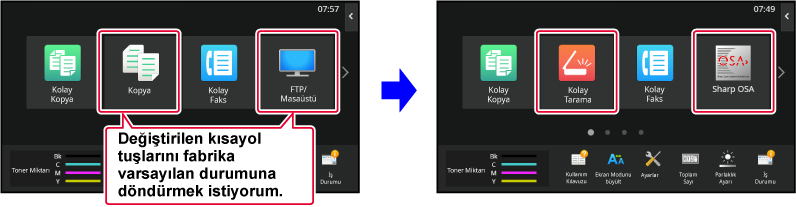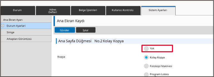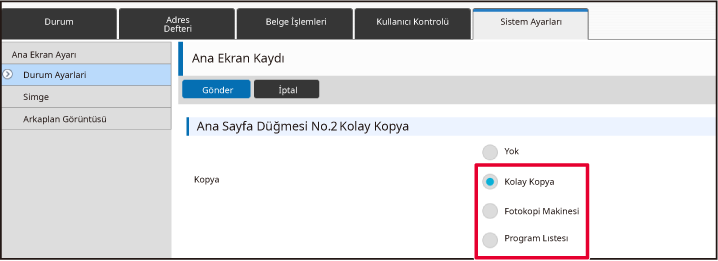 Bazı ayarlar için [Ana Ekran Ayarı] bölümünü tıkladıktan sonra kullanıcı parolanızı girmeniz gerekebilir. Kullanıcı kimlik doğrulaması yapmadıysanız, yönetici parolasını girmelisiniz.[Durum Ayarlari] bölümünü tıklayın ve değiştirmek istediğiniz kısayol tuşunu tıklayın.