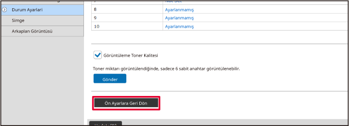 Bazı ayarlar için [Ana Ekran Ayarı] bölümünü tıkladıktan sonra kullanıcı parolanızı girmeniz gerekebilir. Kullanıcı kimlik doğrulaması yapmadıysanız, yönetici parolasını girmelisiniz.[Durum Ayarlari] bölümünü tıklayın ve [Varsayılanlara Geri dön] düğmesini tıklayın.
