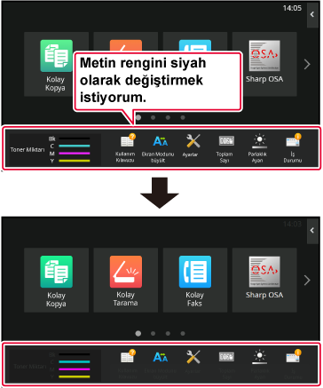 Ayarlar makineye kaydedilir ve uygulanır.Kopyalama veya görüntü gönderme gibi bir