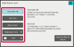 [Kağıt Seç] tuşuna dokunarak kağıt türünü değiştirirken, [Tür] sekmesine dokunun ve kağıt türünü seçin.[Boyut] sekmesine dokunun ve yüklenen kağıt boyutuna uyan tuşa dokunun.