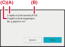 Onay ekranında, taranan orijinal sayfa sayısı (A) alanında, taranan sayfa yüzü sayısı (B) alanında ve boş sayfalar hariç kopya sayısı da (C) alanında gösterilir.Orijinalin açık kısımlarını koyulaştırarak