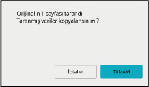 Görüntülenen sayı, taranan orijinal sayfa sayısı değil taranan orijinal yaprak sayısıdır. Örneğin, bir orijinal kullanarak çift taraflı fotokopi çekildiğinde, sayfanın ön yüzünü ve arka yüzünü belirtmek için "2" değil, orijinal yaprağın tarandığını belirtmek için "1" görüntülenecektir.Kopyalama işlemini başlatmak için [TAMAM] tuşuna dokunun.