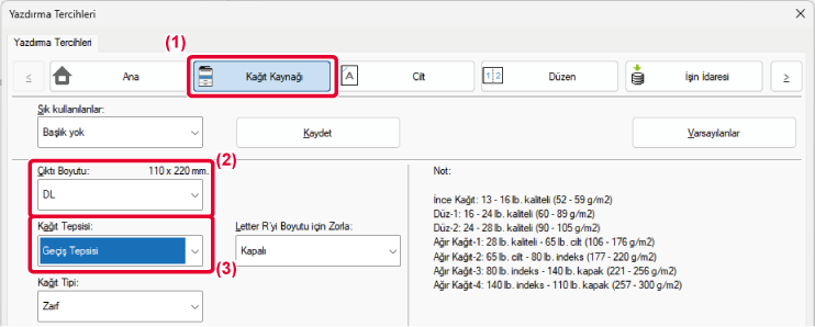 işleminde kullanılacak kağıt boyutunu ve türünü ve kullanılacak