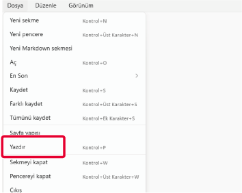 Notepad'in [Dosya] menüsünden [Yazdır]'ı seçin.