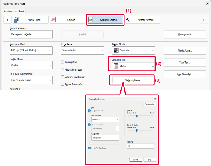 görüntüleme gibi gelişmiş renk ayarları da renkli görüntü yazdırma