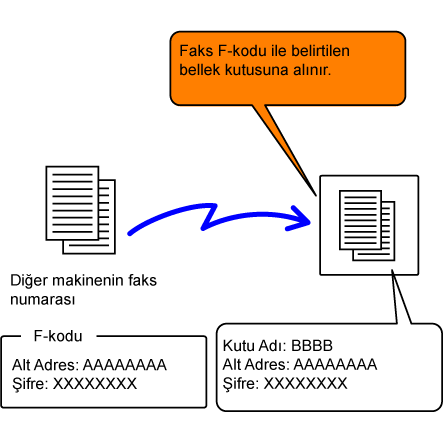 F-kodu ile belirtilen bellek kutusuna kaydedilir. Alınan faksları