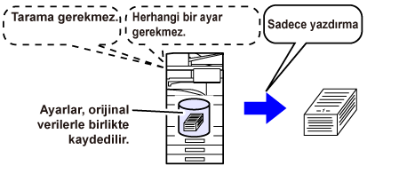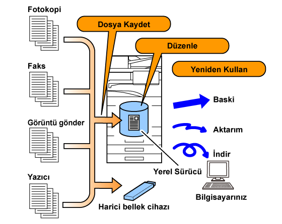 Fotokopi, görüntü gönderme ve diğer işler yapılırken bu işlev belge verisini yerel sürücüye kaydeder. Hızlı Dosya'dan farklı olarak etkin dosya yönetimi sağlamak için dosya kaydedilirken çeşitli bilgi türleri dosyaya eklenebilir. Bir parola da belirlenebilir. |