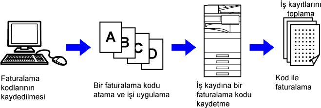 Verimli yönetim sağlamak için yapılan yazdırma ve gönderme işlerinin sonuçlarını kategorilere ayırmada kullanılır. Örneğin müşteriye göre bir kod atayabilir ve iş kayıtlarından müşteriye göre maliyet bilgisini elde edebilirsiniz. Kod örneği: Firma A yayımı |