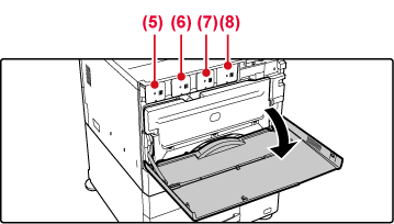 After the toner cartridge is replaced, the machine automatically enters image adjustment mode. Do not open the front cover while this is occurring.Warning