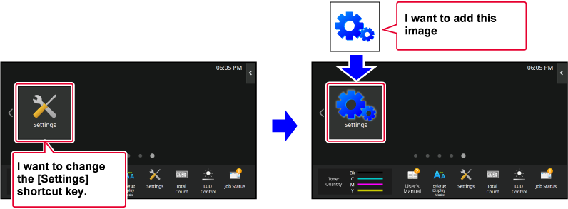 The settings are saved in the machine and applied.To change a shortcut key image to a new