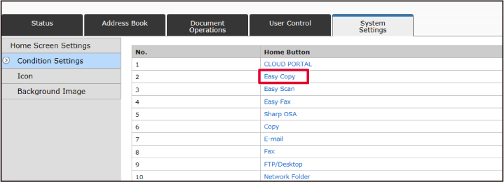 Some settings may require that you enter your user password after clicking [Home Screen Settings]. If you did not perform user authentication, you must enter the administrator password.Click [Condition Settings], and click the desired item under "Fix Key".