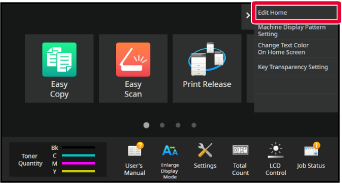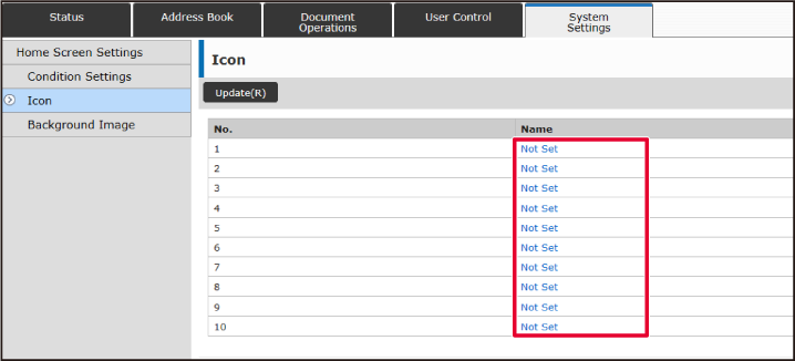 Some settings may require that you enter your user password after clicking [Home Screen Settings]. If you did not perform user authentication, you must enter the administrator password.Click [Icon].