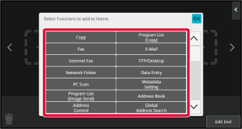 Some settings may require that you enter your user password after clicking [Home Screen Settings]. If you did not perform user authentication, you must enter the administrator password.Select the function you want to add.