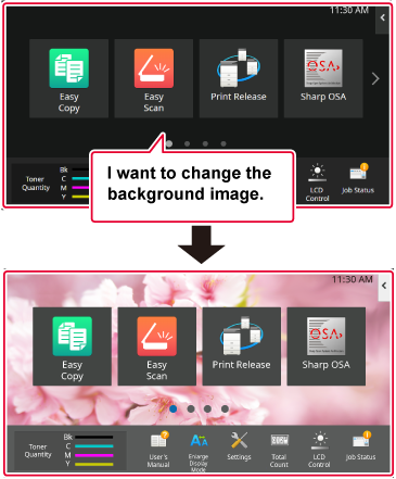 Some settings may require that you enter your user password after clicking [Home Screen Settings]. If you did not perform user authentication, you must enter the administrator password.Click the [Change] button in [Background Image].