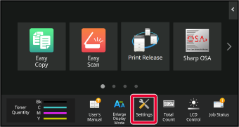 When the USB device is connected to the machine, the popup window will be appeared. Tap the [OK] key.Tap the [Settings] key on the Home screen.