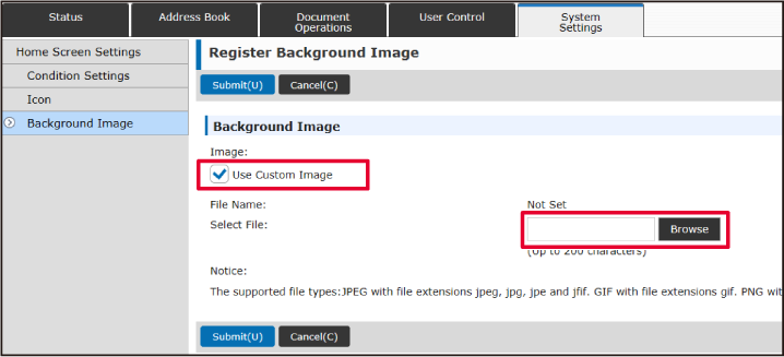 The "Register Background Image" screen will be appeared.Set the [Use Custom Image] checkbox to
