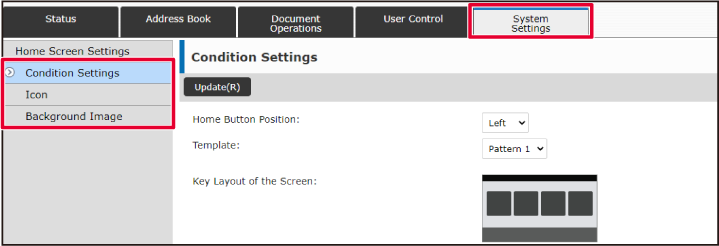 Some settings may require that you enter your user password after clicking [Home Screen Settings]. If you did not perform user authentication, you must enter the administrator password.Click [Condition Settings] and select the desired layout pattern from the "Template".